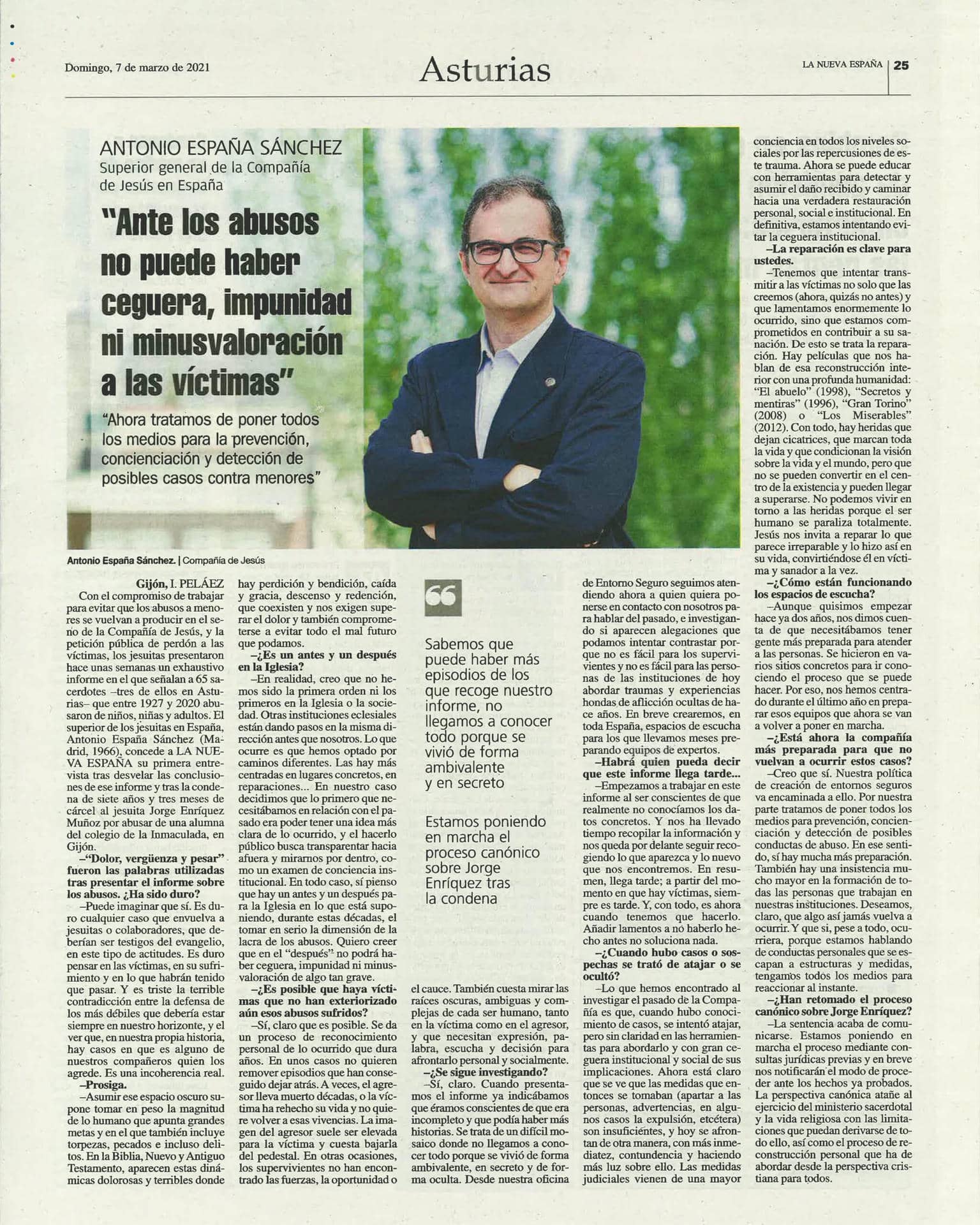 Con el compromiso de trabajar para evitar que los abusos a menores se vuelvan a producir en el seno de la Compañía de Jesús, y la petición pública de perdón a las víctimas, los jesuitas presentaron hace unas semanas un exhaustivo informe en el que señalan a 65 sacerdotes –tres de ellos en Asturias– que entre 1927 y 2020 abusaron de niños, niñas y adultos. El provincial de los jesuitas en España, Antonio España Sánchez (Madrid, 1966), concedió a LA NUEVA ESPAÑA su primera entrevista tras desvelar las conclusiones de ese informe y tras la condena de siete años y tres meses de cárcel al jesuita Jorge Enríquez Muñoz por abusar de una alumna del colegio de la Inmaculada, en Gijón.