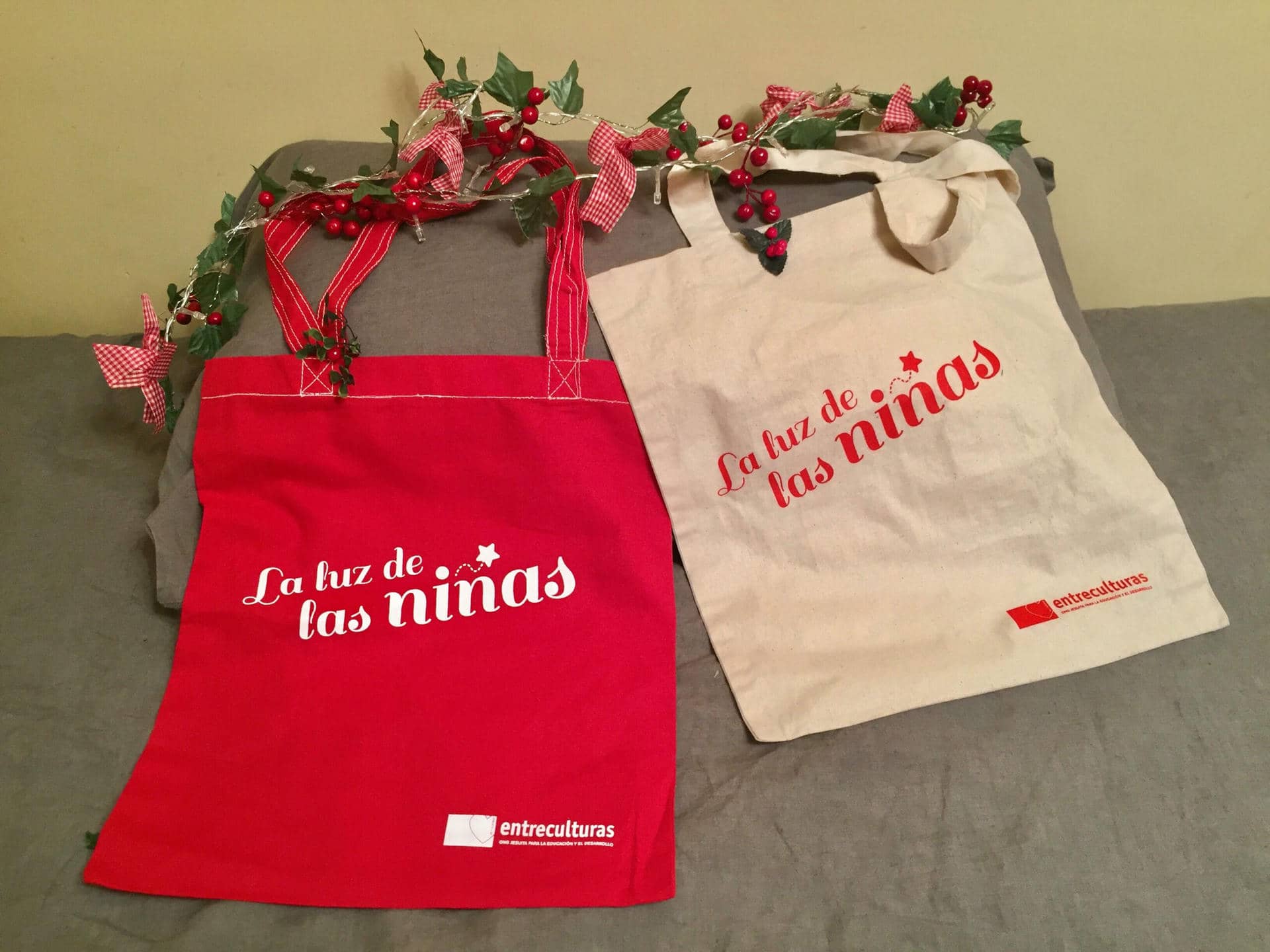 Bolsas Solidarias de Entreculturas de la campaña “luz de las niñas”, se venden a 8 € y lo recaudado se destina al proyecto de Entreculturas Asturias en la RD del Congo, puedes ver el proyecto en el siguiente enlace: https://www.laluzdelasninas.org/