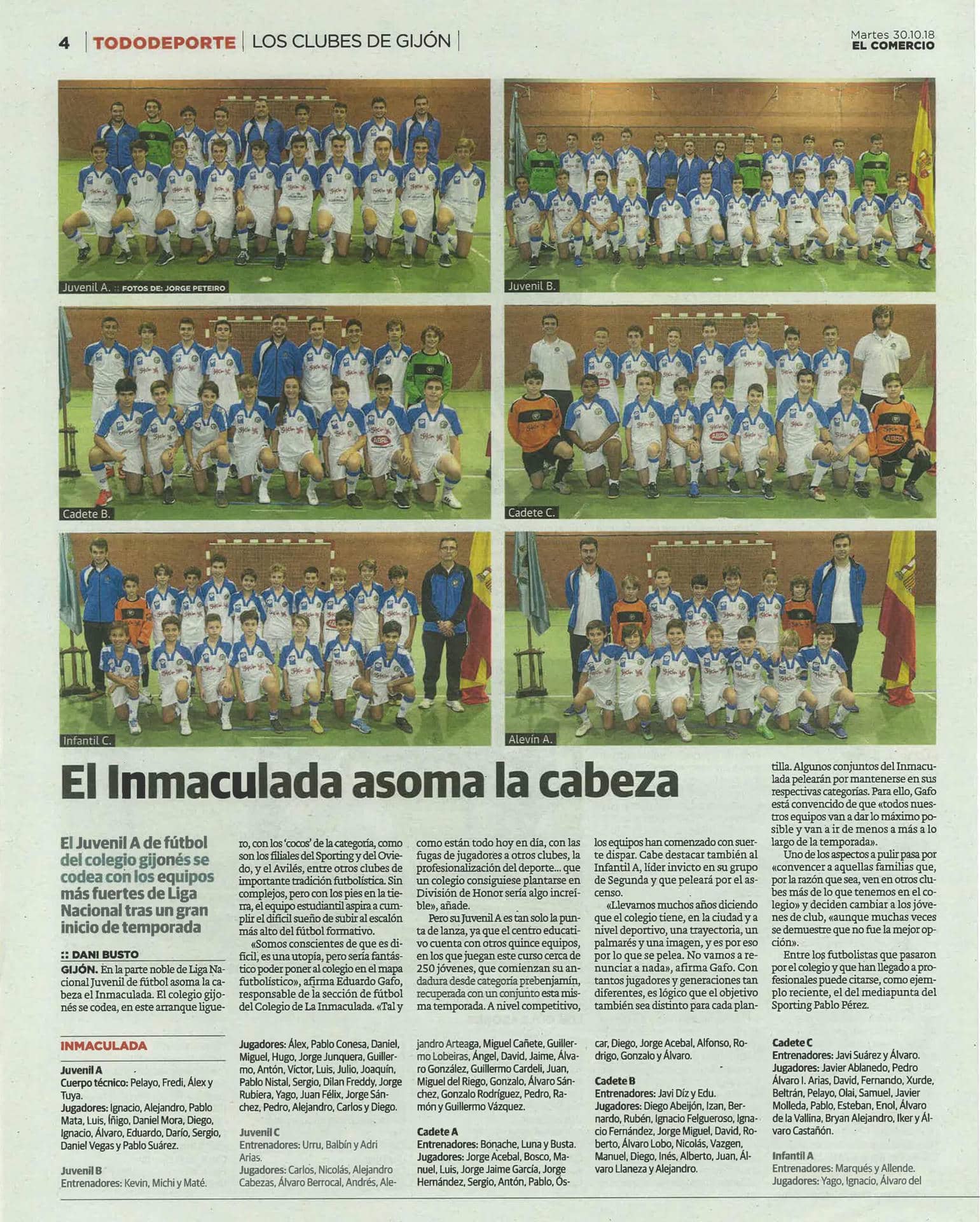 Recoge a doble página EL COMERCIO información sobre la presentación de los equipos de fútbol del colegio de la Inmaculada. 250 jugadores componen los 16 equipos que van desde prebenjamín hasta juvenil.