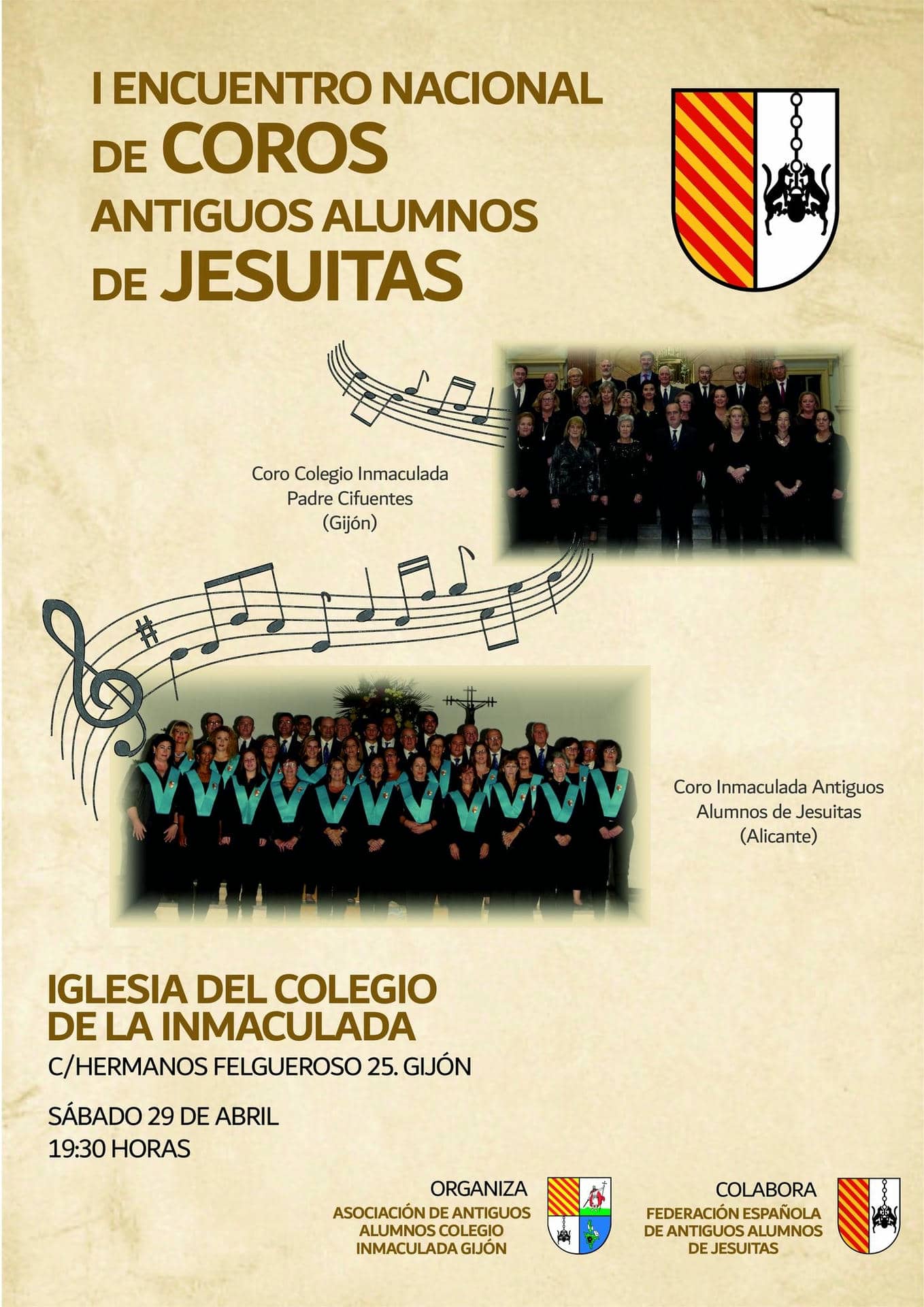 Gijón será la sede el próximo sábado 29 de abril del I Encuentro Nacional de Coros de AAA de jesuitas, iniciativa que partió de la Asociación de Antiguos Alumnos del colegio de la Inmaculada que lo organiza en colaboración con la Federación Española de Asociaciones de Antiguos Alumnos. Se abre para el futuro un nuevo camino para compartir un nuevo motivo para reunirnos, una oportunidad más para conocernos.