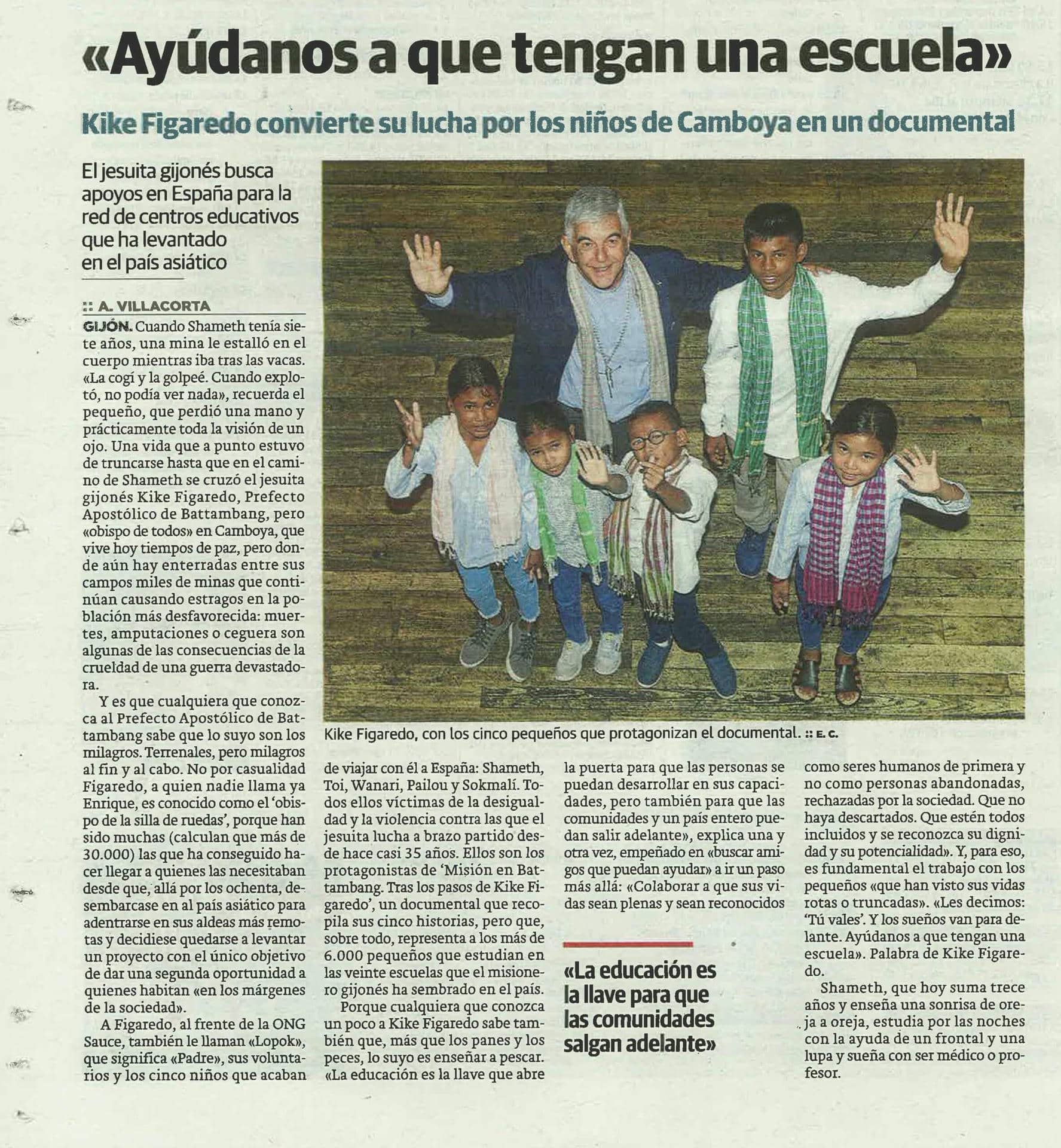 El diario EL COMERCIO informa en la última pagina de su edición de hoy, sobre el documental que ha venido a presentar en España el misionero gijones P. Kike Figaredo, SJ. El documental «Misión en Battambang. Tras los pasos de Kike Figaredo», relata la historia de cinco niños camboyanos, Toi, Wanari, Pailou, Shameth y Sokmalí, todos ellos víctimas de la guerra, de la pobreza o de la injusticia extrema, y que le acompañan en este viaje.