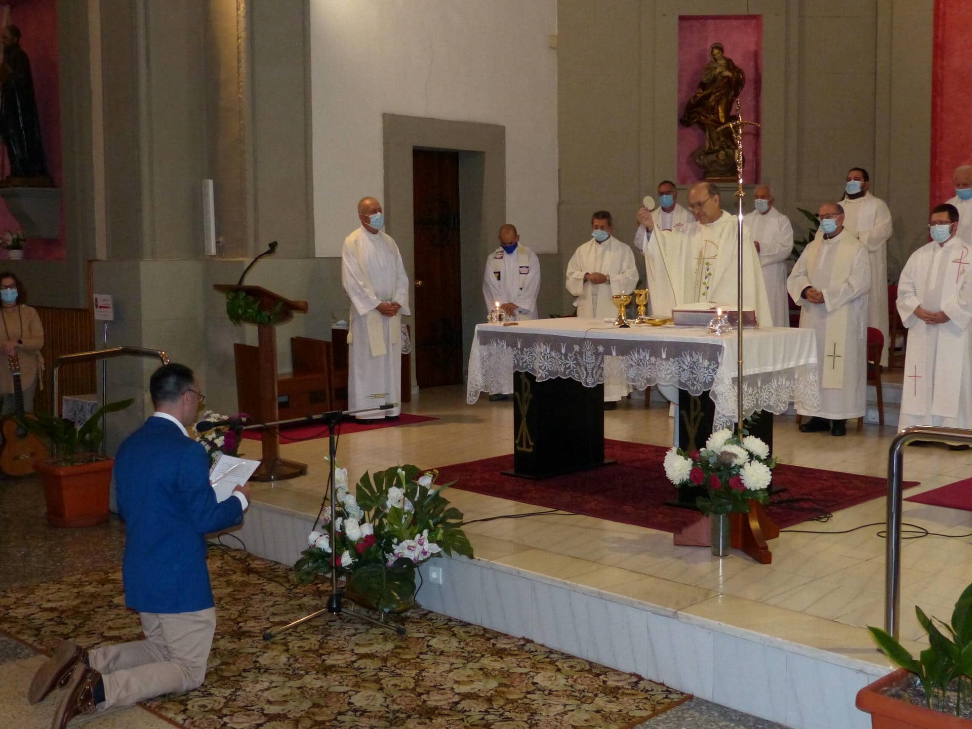 Chema estuvo acompañado por los jesuitas de las dos comunidades de la Plataforma de Asturias, así como bastantes compañeros jesuitas que vinieron de otros lugares de la Provincia. Sus padres, hermano, abuela y algunos otros familiares se desplazaron a Gijón para estar al lado suyo en este momento tan importante en su vida como jesuita. A la celebración asistieron también personas del grupo de la misa de los domingos de las 20:00 h. del Colegio Inmaculada (que animaron con los cantos la Eucaristía), personas vinculadas al Hogar de S. José y a la parroquia, así como jóvenes de los grupos universitarios del centro Loyola y otras personas del barrio y de la ciudad de Gijón.